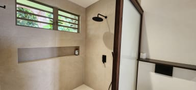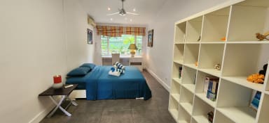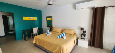 The 5th bedroom is located in the independent bungalow at the left end of the pool. The bungalow has a well-ventilated bathroom and spacious ceiling height. Despite not having air conditioning, it includes a ventilator.