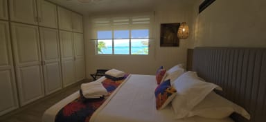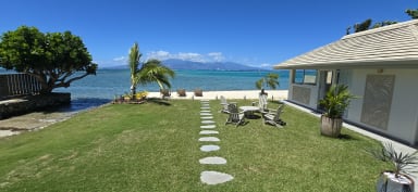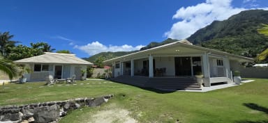 The property includes a main house and an independent bungalow, both offering unobstructed views. The main house features a bright living room with a smart TV, an elegant dining area, and a modern, fully equipped kitchen (stove, hood, refrigerator, oven, dishwasher, microwave, espresso machine). Thanks to large bay windows, these spaces naturally extend towards the garden and a spacious terrace offering a breathtaking view of the lagoon and the island of Tahiti.