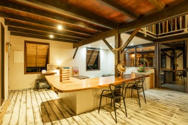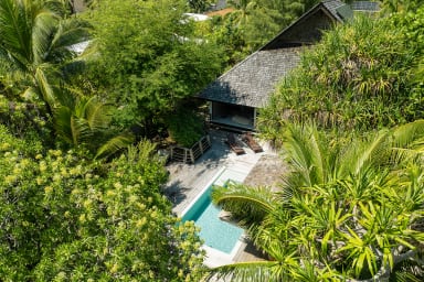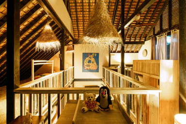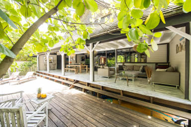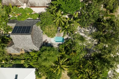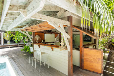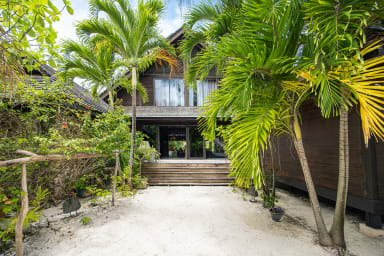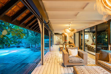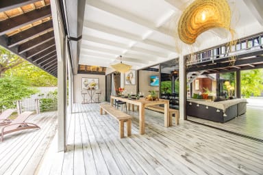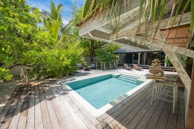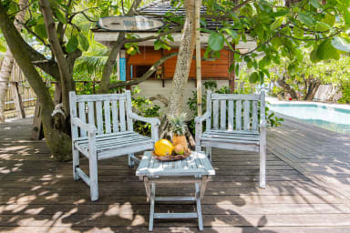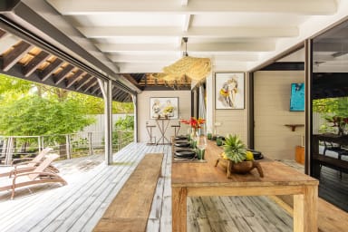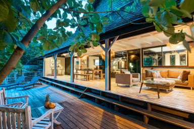 Entirely crafted from wood and featuring a beautiful exposed roof structure, this warm and inviting holiday home offers generous open-air living spaces, creating a full immersion into the islands’ authentic lifestyle.