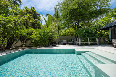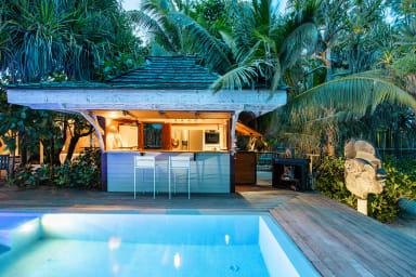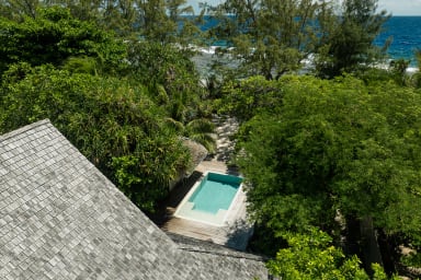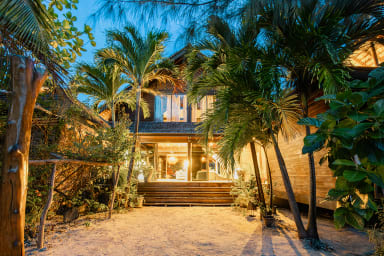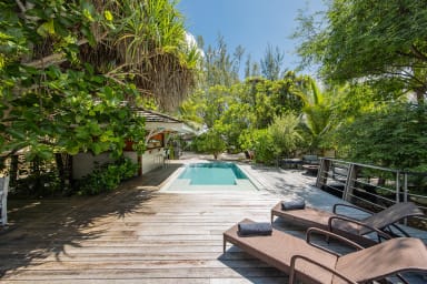 Charming beachfront home with pool right on a beautiful white-sand beach. Two air-conditioned bedrooms and a mezzanine (sleeps 8).