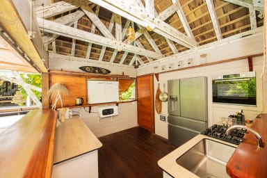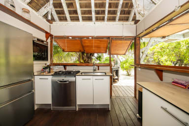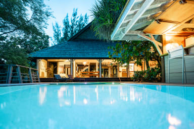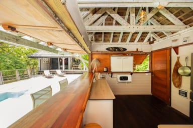 The house, designed in a Balinese style, features open and airy spaces. It may not suit those who prefer modern, fully enclosed interiors. The kitchen is located in a separate module on the pool deck and is accessible only from the outside.