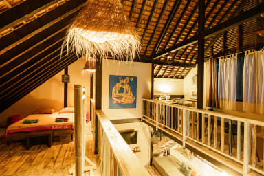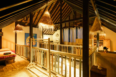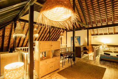 Upstairs, a spacious mezzanine offers four double beds and ceiling fans, making it ideal for hosting family and friends.