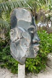 The sandy garden, framed by the motu’s lush vegetation, features a magnificent sculpture by Teva Victor, an artistic nod to the Polynesian spirit of the place.