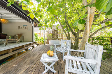 An outdoor dining table, sheltered and accessible from the living room, is set on the wooden deck—perfect for enjoying the natural surroundings while staying in the shade.