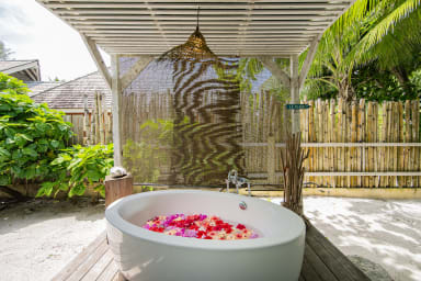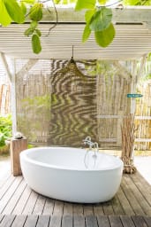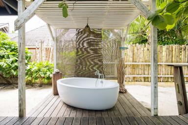 An additional outdoor water point includes a large bathtub, offering a peaceful wellness space open to nature.