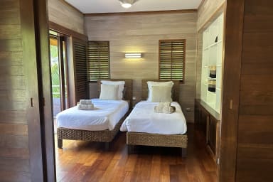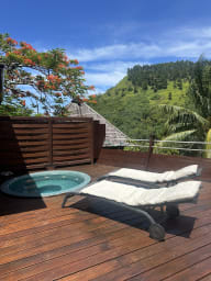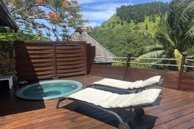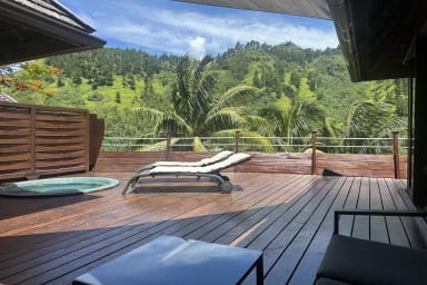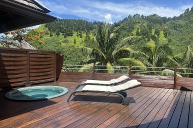 Elegant single-level vacation rental in Moorea, Balinese-style, featuring three bedrooms, a terrace with an outdoor hot tub, and a peaceful setting within a private and secure residence.