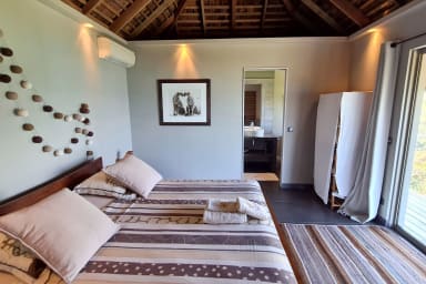 Sur ce même niveau se trouve aussi la chambre principale équipée d'un lit king size, d’une salle de bain incluant une douche, deux lavabos et un WC.La particularité de la chambre principale est sa fenêtre au pied du lit allant du plafond au plancher donnant l’impression de surplomber la nature et le lagon. Le réveil avec une telle vue est un pur délice !