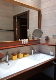 La résidence qui est entièrement sécurisée est un havre de paix, regroupant des villas en bois parfaitement intégrées à l'environnement.