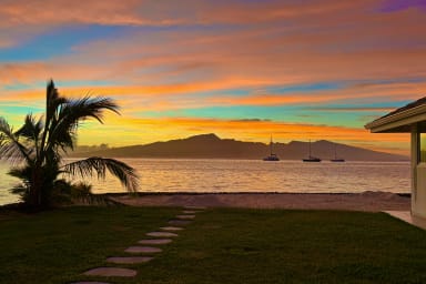 Le jardin ensoleillé s’ouvre sur une plage de sable blanc bordée de cocotiers, offrant un accès direct au lagon. Depuis la terrasse, la vue panoramique sur l’océan et l’île de Tahiti est spectaculaire, de jour comme de nuit. Le soir venu, les couchers de soleil embrasent le ciel de nuances flamboyantes qui se reflètent sur les eaux calmes du lagon.