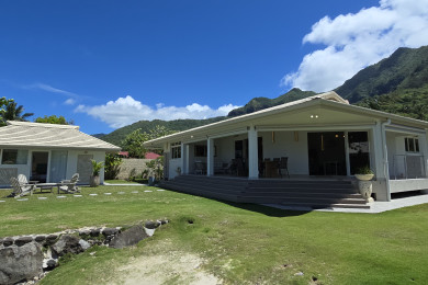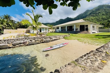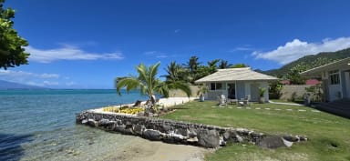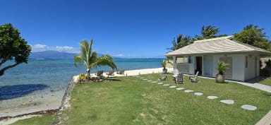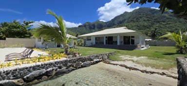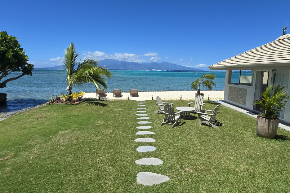 Cette villa en location saisonnière bénéficie d’un accès direct à la mer, avec possibilité d’amarrer un petit bateau devant la propriété via la passe de Vaiare.