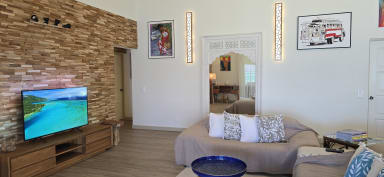 Dès l’entrée, l’élégance de son architecture moderne séduit : les hauts plafonds assurent une aération optimale et une belle sensation d’espace, tandis que le mur du séjour habillé de bois naturel apporte chaleur et authenticité à la décoration intérieure. L’ensemble crée une ambiance raffinée, conviviale et en parfaite harmonie avec son environnement.