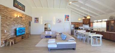 Grâce à de grandes baies vitrées, ces espaces se prolongent naturellement vers le jardin et une vaste terrasse offrant une vue imprenable sur le lagon et l'île de Tahiti.